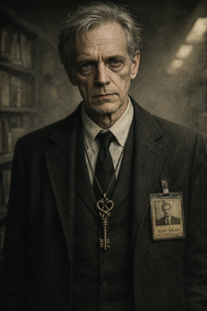 Homme. Apparence soignée, tenue sombre, posture rigide. Âge indéterminé (la trentaine ?). Cheveux blond cendré, coupés avec une précision excessive. Visage pâle, traits symétriques, presque figés.